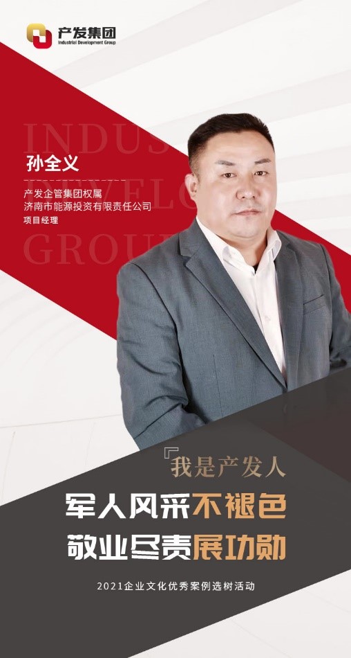 孫全義,現(xiàn)任產(chǎn)發(fā)企管集團權屬濟南市能源投資有限責任公司(以下簡稱“能投公司”)項目經(jīng)理。2001年參軍,在部隊期間刻苦訓練,聽黨指揮,服從命令。2003年他從部隊光榮退役,隨后加入能投公司。期間曾借調(diào)至濟南市發(fā)改委幫助工作,現(xiàn)負責能投公司的資產(chǎn)管理工作。